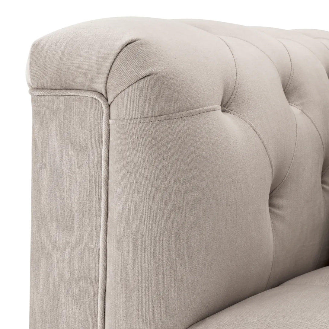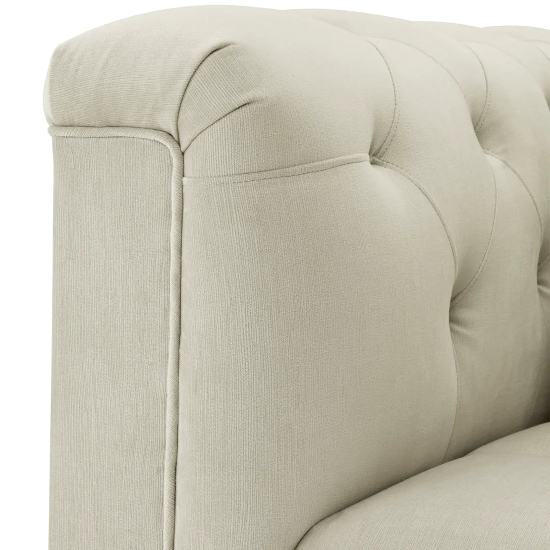 Inspired by the classic Chesterfield furniture, the Cesare Chair in pebble grey upholstery offers a more subtle button back design, gently curving with straight line embroidered stitching.