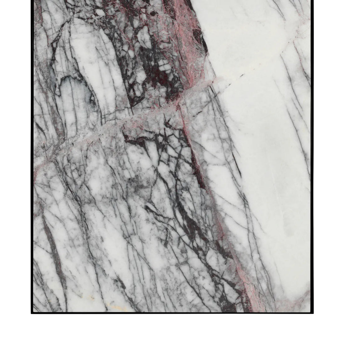 This sophisticated console features a bronze finished frame and a beautiful white marble top with subtle accents of grey, black and red tones.