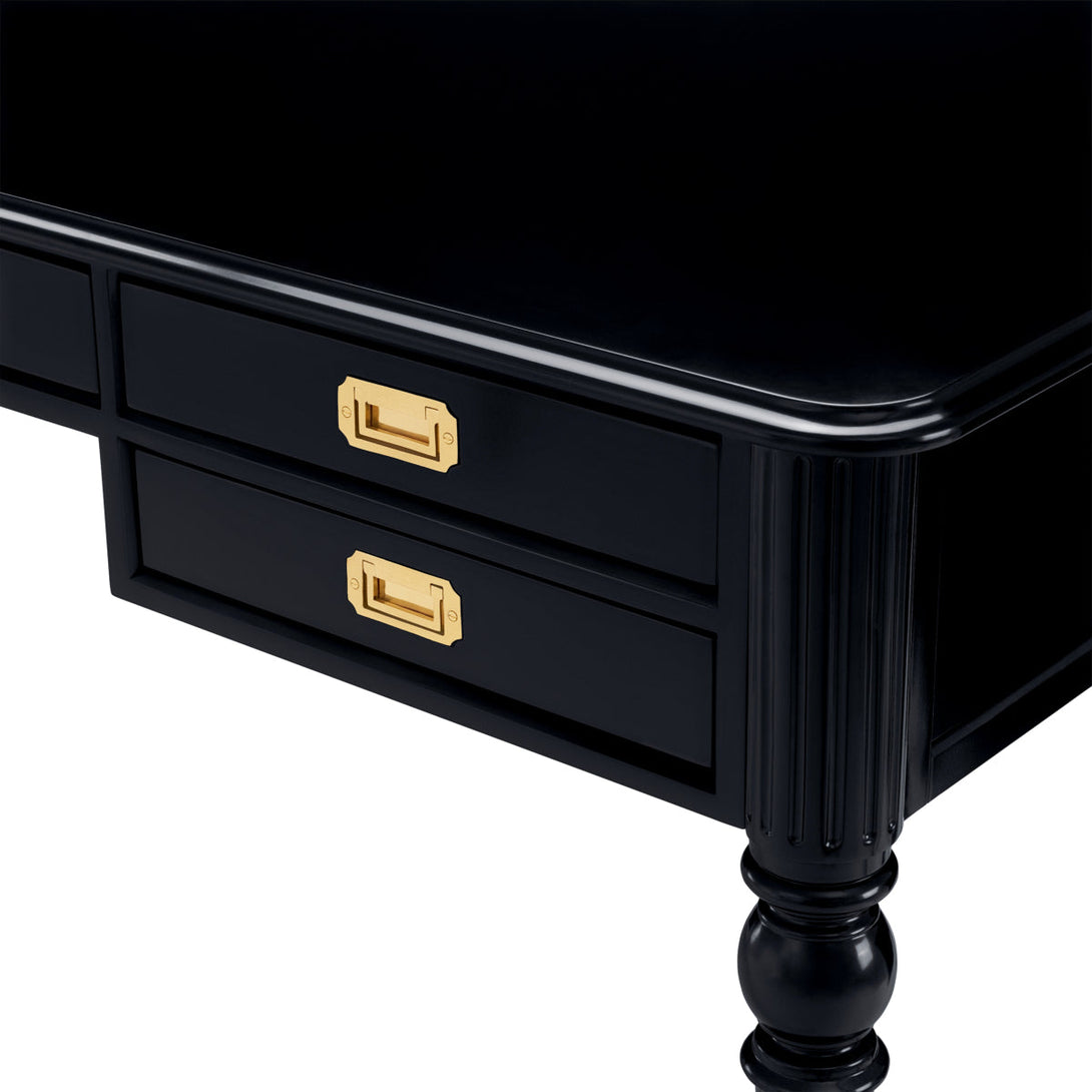 Inspired by an elegant design for a Louis XVI period–style desk (ca. 1900–14), our interpretation characterized by four slender balusters shaped legs and five drawers is finished in a black waxed finish. Its historical charm seamlessly blends with modern sophistication, offering a timeless and elegant addition to your workspace.HISTORIC PROVENANCE