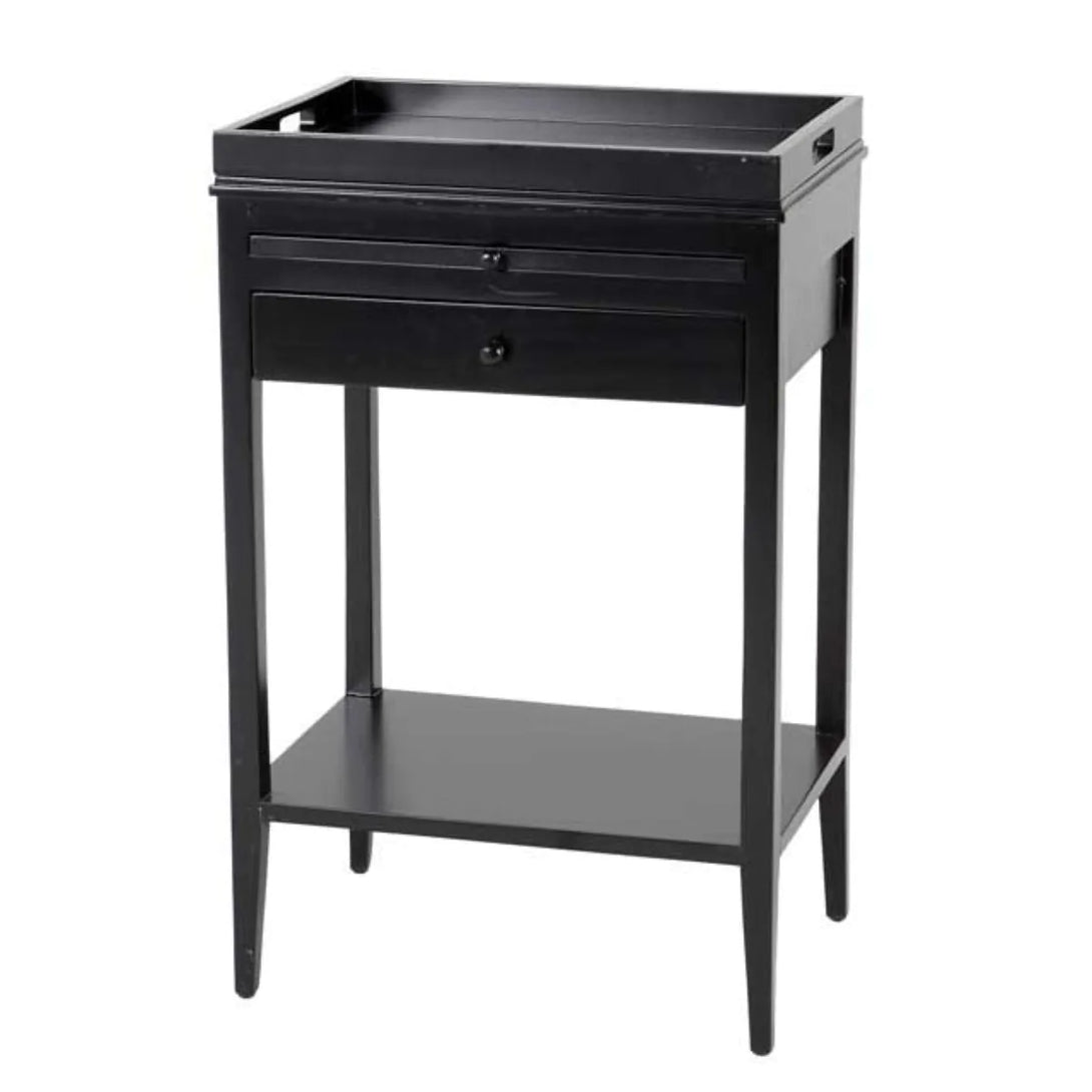 This black finished side table features a tabletop with tray and extension leaf and a lower shelf. It looks great combined with the Bleeker Side Table set of 2.
